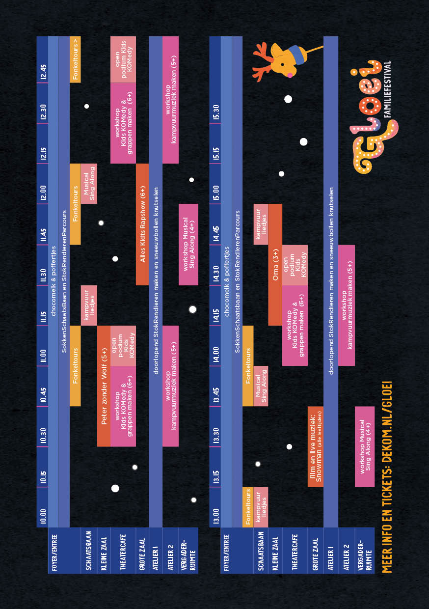 Op zondag 25 januari, van 10.00 tot 15.30 uur, tijdens het Nationaal Theaterweekend, verandert DE KOM in een sprankelend winterfestival voor de hele familie. Stap binnen in een wereld vol verhalen, verwondering, creativiteit, muziek en plezier. Ga naar een voorstelling, doe mee aan een workshop en warm je op aan poffertjes & chocomelk. Een ticket voor één van de voorstellingen geeft toegang tot alle workshops en activiteiten tijdens het festival. KOM het meemaken!